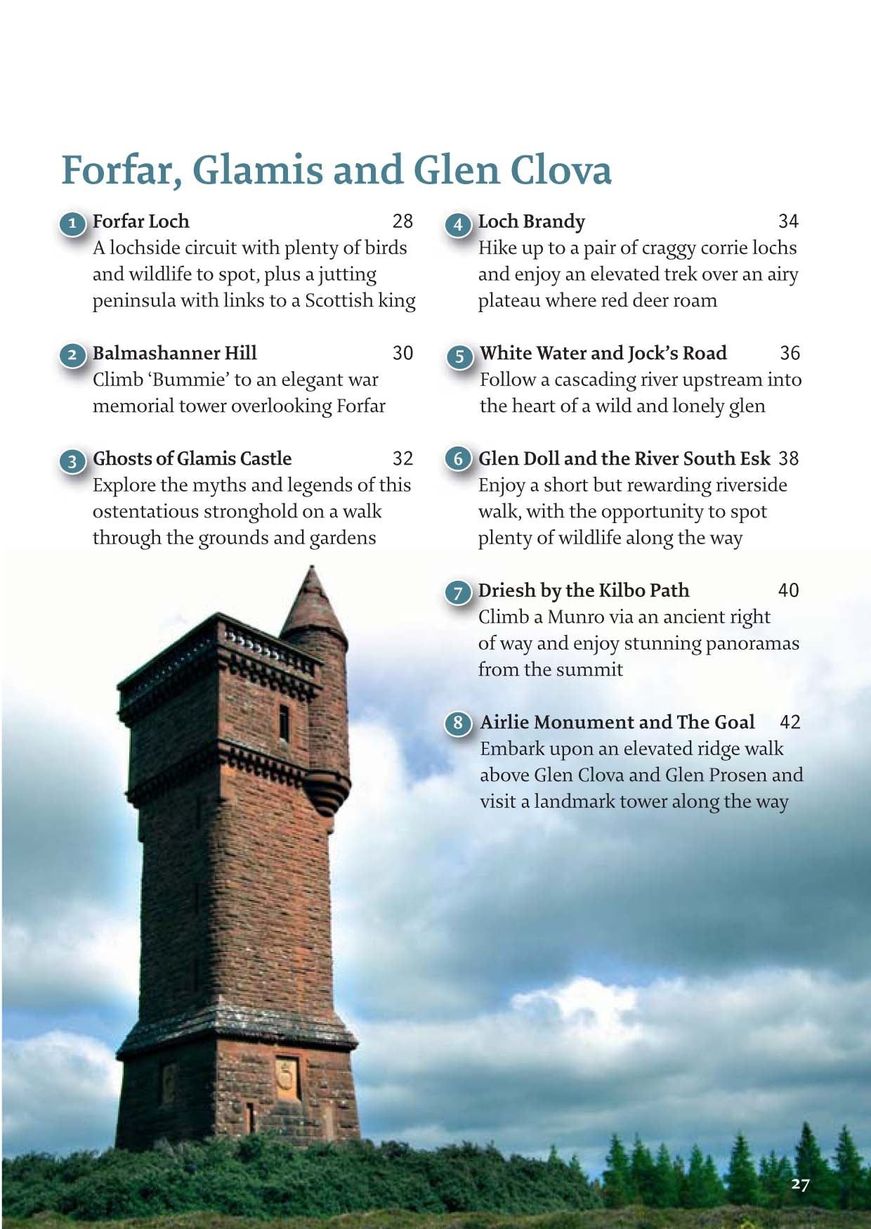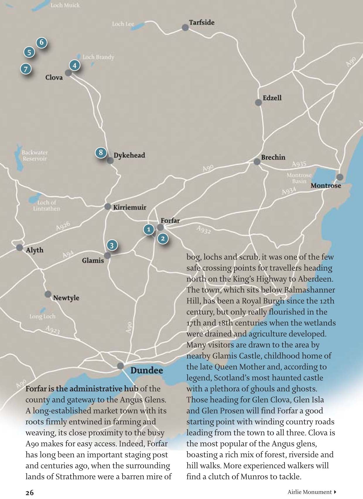 Angus is the historical heartland of Scotland, a county where the past has left an indelible mark on the present. Prehistoric forts, ancient castles and Pictish standing stones dot a rich and varied landscape where bracing coastal hikes, tranquil riverside rambles, sheltered woodland wanders and more challenging hill ascents await the walker.