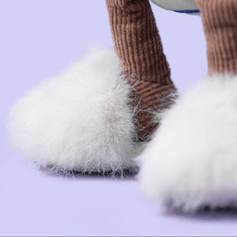 Rosie Lea is an adorable cup of tea who keeps her cordy boots nice and snug in the sweetest pair of fluffy slippers.