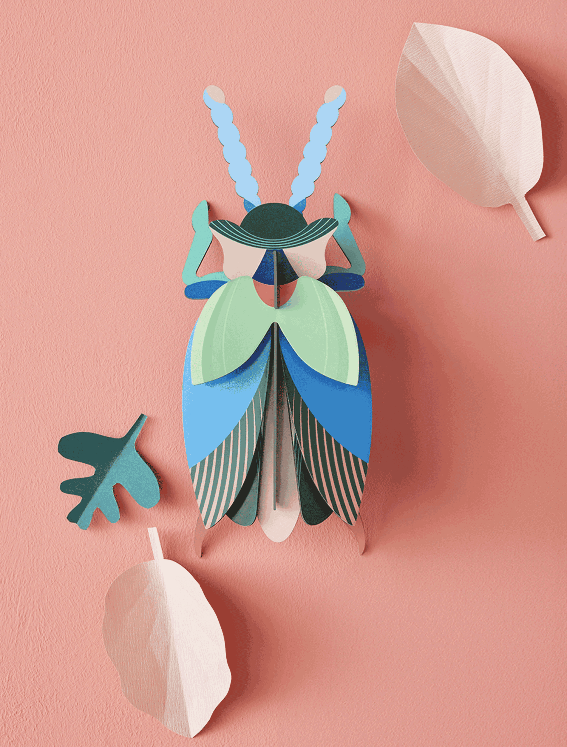 In real animal life, they inconspicuously scuttle about under leaves and on branches, but these flamboyant and colourful beetles – from every corner of the world – look as if they have just stepped off the catwalk. Give them a place among your artistic treasures, hang them on the wall, let them crawl around on your table and create your own insect story.