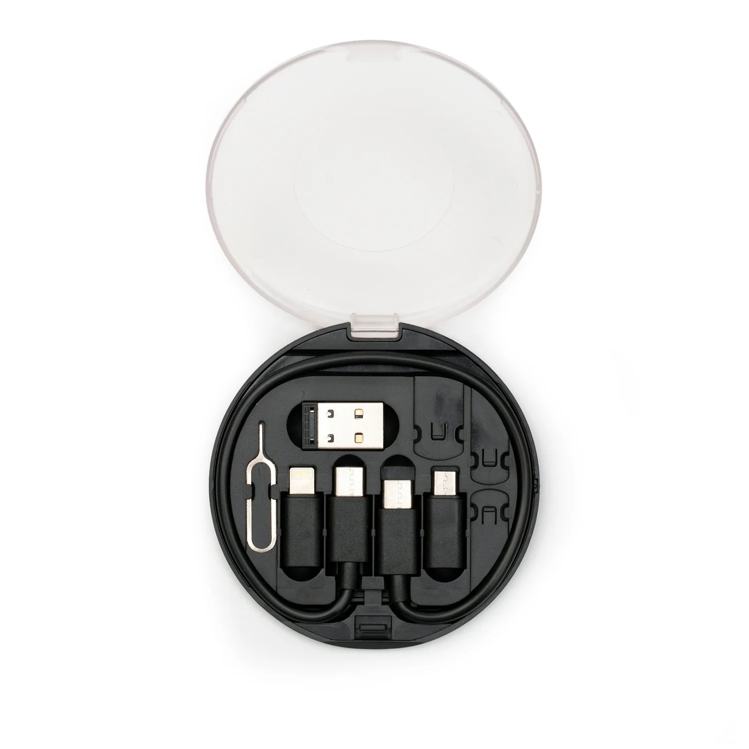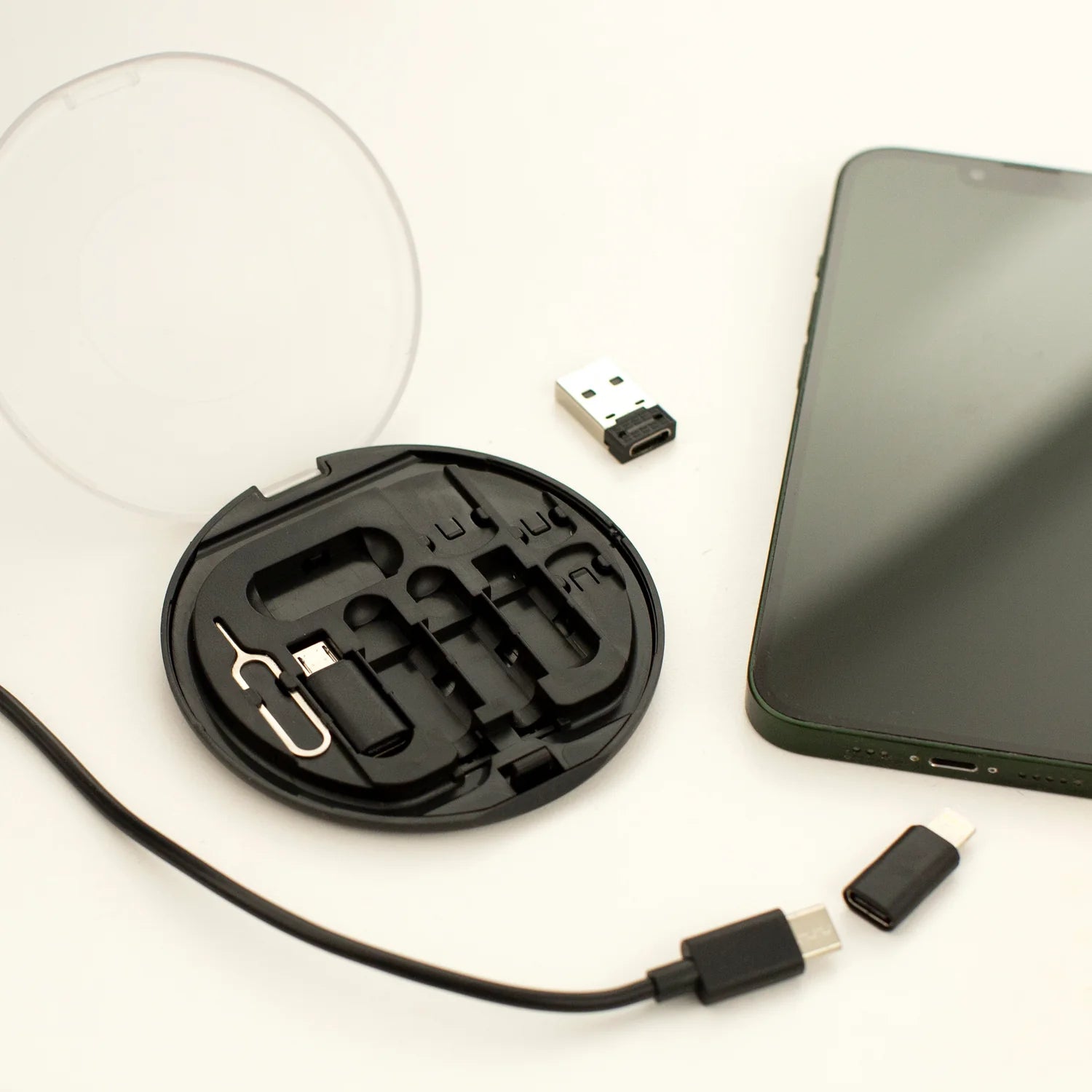 Charge all your devices on the go! Includes USB to Lightning, USB to micro-USB, USB to type C, type C to micro-USB, type C to type C, type C to Lightning, SIM card removal pin, micro SIM card storage/Micro SD, and 2 slots for nano SIM cards. All of that and a phone stand, all within a handy travel case. Compatible with all smartphones.